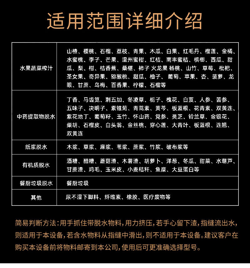 由于待脫水物料種類繁多,不同物料的含水率、分子水比例、粘度、纖維含量、吸水性、韌性、有機(jī)物或無機(jī)物等等數(shù)據(jù)各有不同,我公司工程師會(huì)根據(jù)每一位客戶提供的待脫水的物料進(jìn)行分析,計(jì)算出適用于該物料的參數(shù),制作出適合的設(shè)備,將物理壓榨作用利用到**,降低擠出物料含水率。